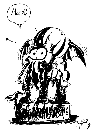 Den Anfang jedoch macht ein alter, erfolgloser aber nichtsdestotrotz begabter Künstler mit Namen Stefan Rieck, ein Freund der Familie noch dazu und ansonsten eher in der Star Wars-Szene zu Hause. Er zeichnet unter anderem auch für das Star Wars-Journal des offiziellen Star Wars-Fan-Clubs. Hier nun sein Glanzstück, nur für euch und mich: CTHULHUS RUF