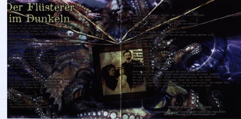 unten, im Salon der Toten Rate, Mutter, rate wer dann vor mir steht Ich würde es dir ja sagen, doch er hat es verboten Vater ist zurück!..." Interessant auch das Artwork im Booklet zu diesem Text! Irgendwie beunruhigend, diese Tentakel... Insgesamt ein Album, das mir nach mehrmaligem Hören immer besser gefällt, wenn es auch seine Schwächen hat. Der teilweise übertrieben laute Gesang stört m. E. an einigen Stellen etwas die Atmosphäre, wo er ruhig gesungen vielleicht intensiver hätte sein können. Die Musik ist fast immer sehr passend und in den gemächlicheren Passagen sehr verstörend und gänsehauterzeugend. Meine Freundin nennt das treffend morbide. Geheimtip: Isaak"! Man kommt ins Grübeln, ob man die Bibel nicht in eine Reihe mit dem Necronomicon, De Vermis Mysteriis, Unaussprechliche Kulte etc. setzen sollte... Das dieses Album in der einschlägigen Presse der schwarzen Szene (Orkus & Co.) höchst gelobt wird, stellt gewiss keinen alleinigen Kaufgrund dar. Allerdings rate ich auch davon ab, vor dem Kauf reinzuhören, da man so vielleicht verschreckt wird und so ein exzellentes Stück Musik verpaßt, daß sich einem erst nach mehrmaligem Hören völlig erschließt. Nicht das ihr mich mißversteht: Eine besondere, tiefschürfende, Moral-von-der-Geschichts-Rad-artige Botschaft steckt nicht unbedingt hinter dem ganzen (vielleicht habe ich sie auch nur noch nicht gefunden). Vater" ist unheimlich, veranlaßt sadistische Cthulhu-Keeper zu fiesem Schmunzeln (in Erinnerung an vergangene, seinen Spielern angetane Boshaftigkeiten). Eine Mischung aus Electronic/EBM, ein wenig Industrial, einigen (blasphemous... smile!) Folkinstrumenten und einer gehörigen Portion Poe, Lovecraft und Kafka. Wer sich literarisch für letztgenannten Drei interessiert, sollte durchaus zugreifen! Alle anderen auch. Bei Nichtgefallen allerdings kein Geld zurück, die Geschmäcker sind halt doch verschieden...